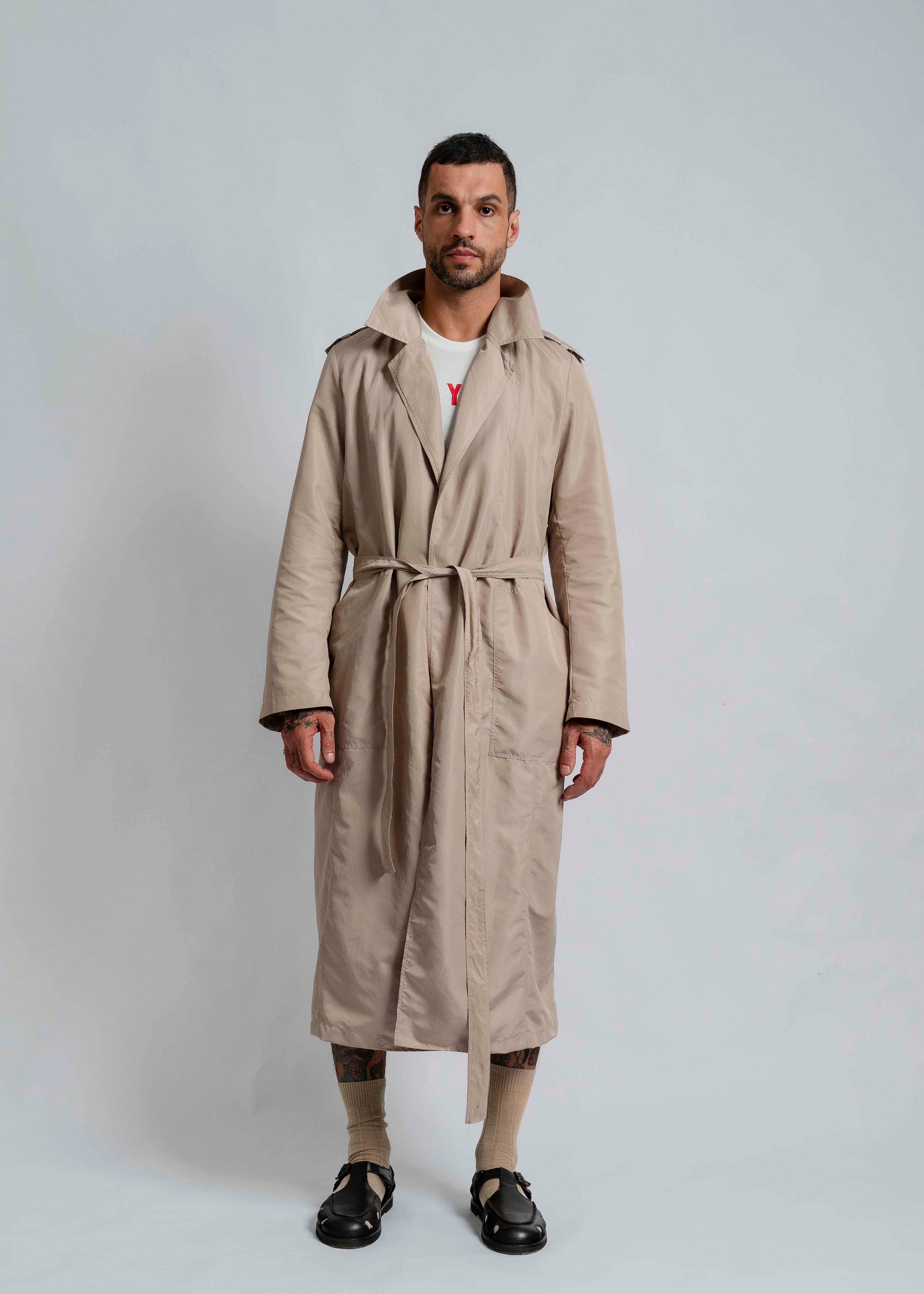 O sobretudo 'Long Trench' da Openstudio é feito de Nylon importado e durável.  Tecido com 57% de fibras recicladas. Cortado em um perfil versátil e oversized, mas discreto, é feito sob medida em um perfil generoso com mangas relaxadas. Aguenta garoa fina e é de secagem super rápida.